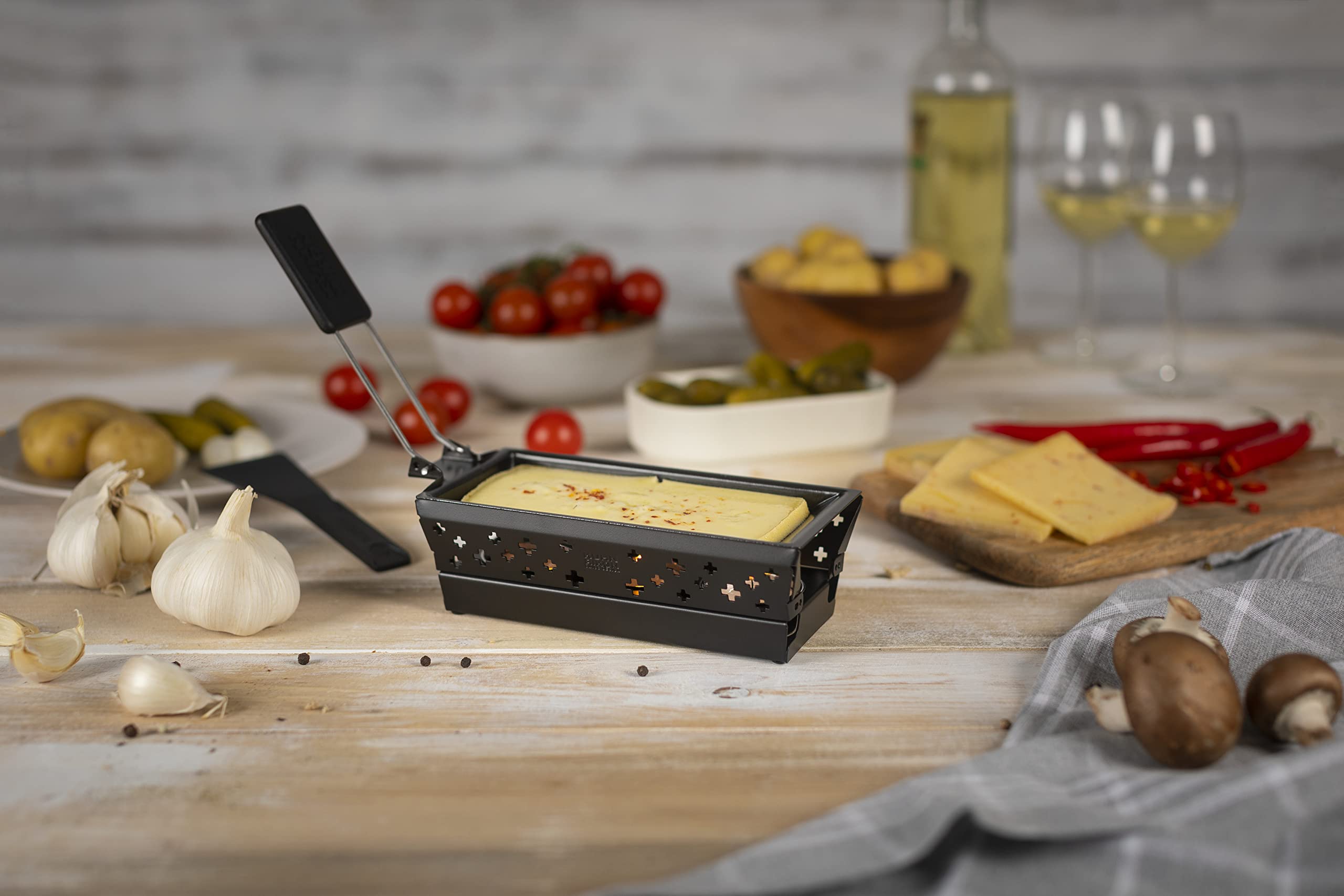 - Includes a mini raclette pan with non-stick coating, 3 candles and a non-stick scraper